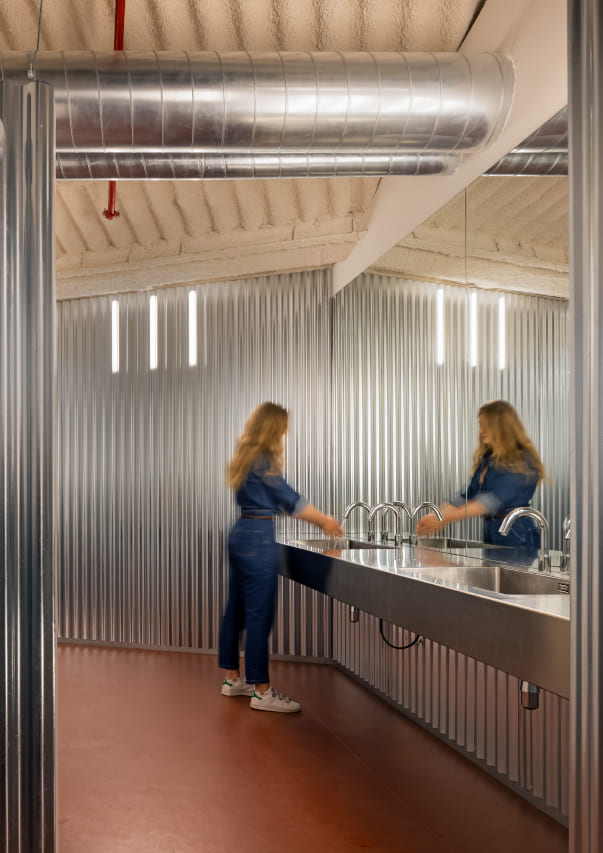 В центъра на трансформацията е банята – пространство, преосмислено не просто като необходимост, а като светилище за служителите. Тук вълнообразните стоманени стени отразяват фасадата на сградата, създавайки усещане за непрекъснатост, като същевременно добавят футуристичен акцент. Минималистичният дизайн е едновременно впечатляващ и функционален, с червен под, контрастиращ на металните повърхности, за да създаде пространство, което изглежда едновременно интимно и просторно.