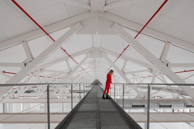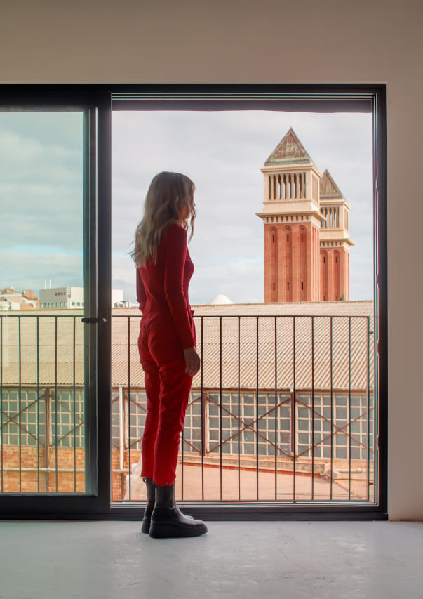 За да превърнат някогашното тясно индустриално помещение в оживена офис среда, дизайнерите играят с цвят, светлина и материали. Просторни прозорци заливат зоната с естествена светлина и разкриват гледки към емблематичната Plaça de Espanya и панаира на Барселона. Вътре внимателното взаимодействие между твърди и меки елементи – бетон, стомана и уютни интериорни акценти – създава динамична атмосфера, която едновременно вдъхновява креативността и насърчава продуктивността.
