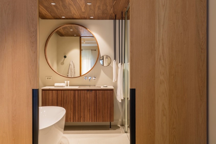 Подобно на внимателно изработените шоколади в работилницата на приземния етаж, всяка стая в хотела е проектирана с изключителна прецизност и внимание. Същото ниво на детайлност е приложено и към баните, които дизайнерите превръщат в изключителни и интимни пространства, сливащи се с основната спалня.