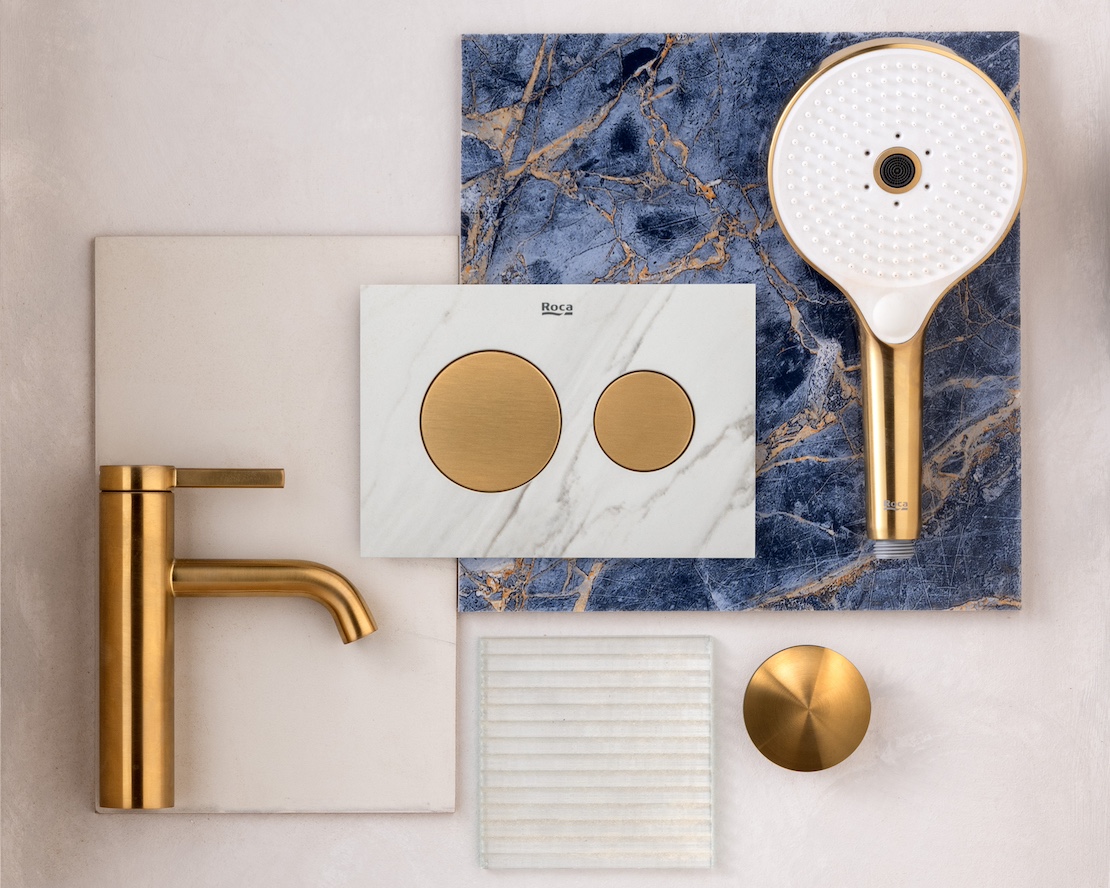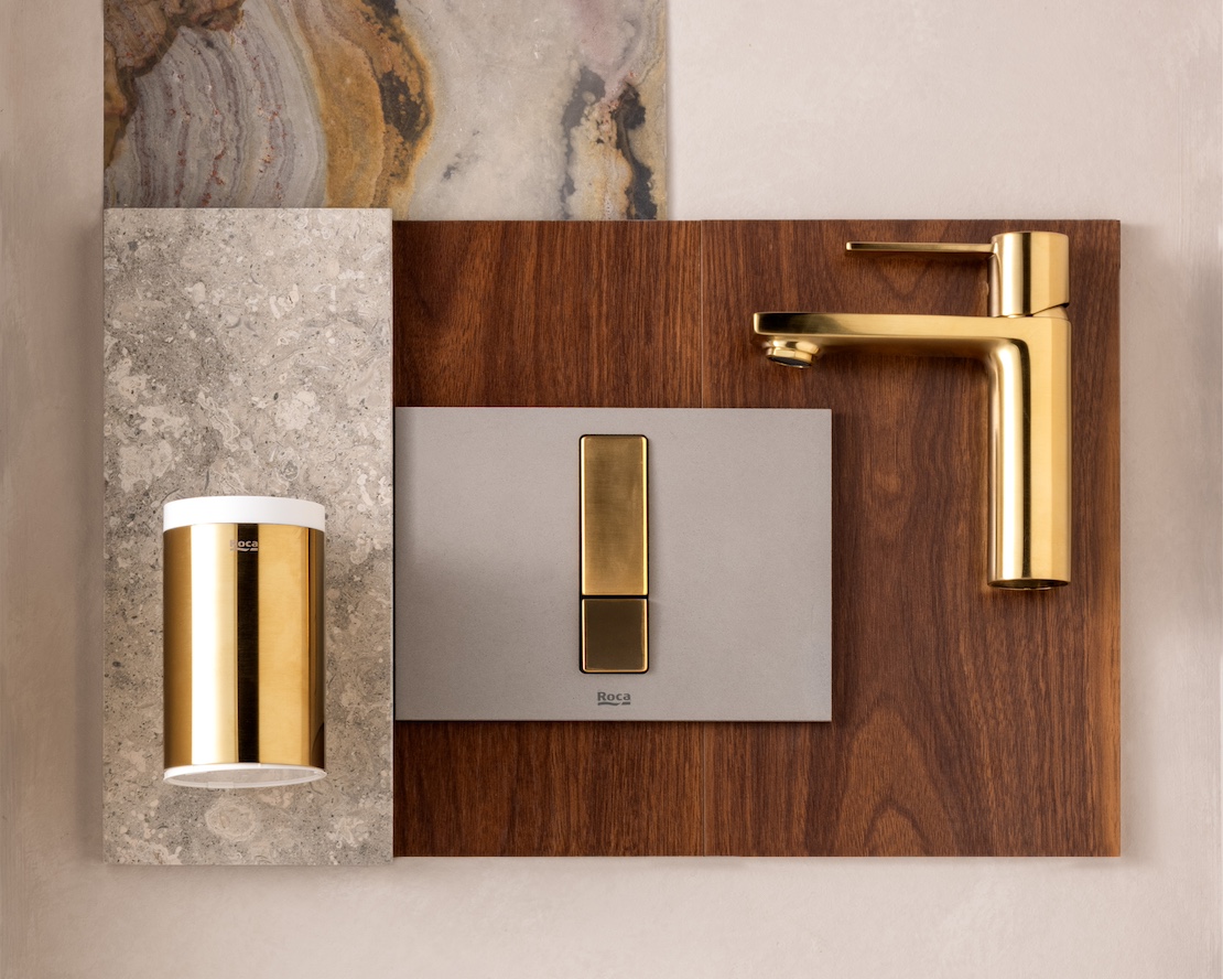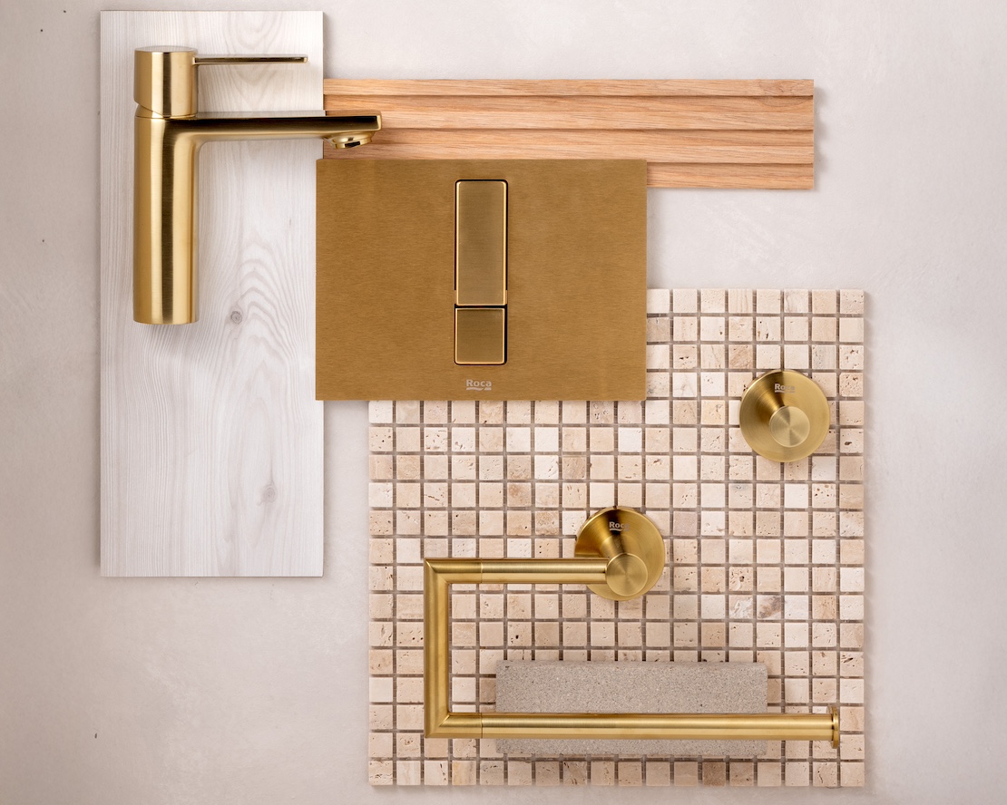 Бутонът, например, играе ключова роля в тази тенденция. Бутон със златно покритие, монтиран в баня с бели мраморни плочки със сиви или сини жилки, подобрява естетиката и добавя фин, но забележим луксозен акцент. Друга отлична опция е съчетаването му с дърво, керамика или камък в неутрални тонове.