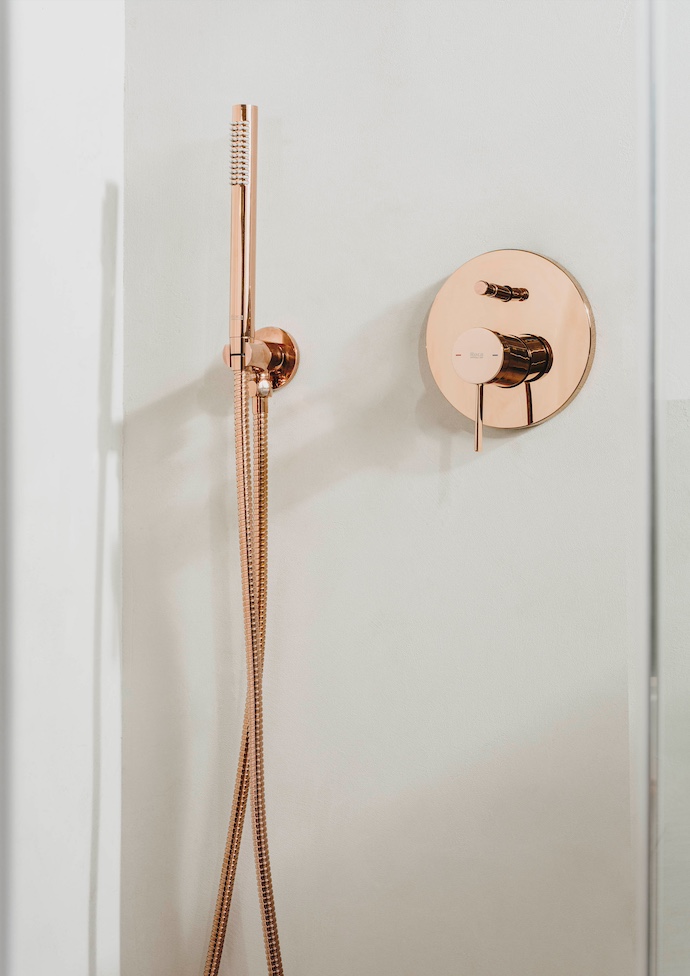 За върховно душ изживяване изберете колекцията Plenum, с душ решения в сатениран месинг и розово злато, които се сливат хармонично с останалите елементи на банята, добавяйки както функционалност, така и стил